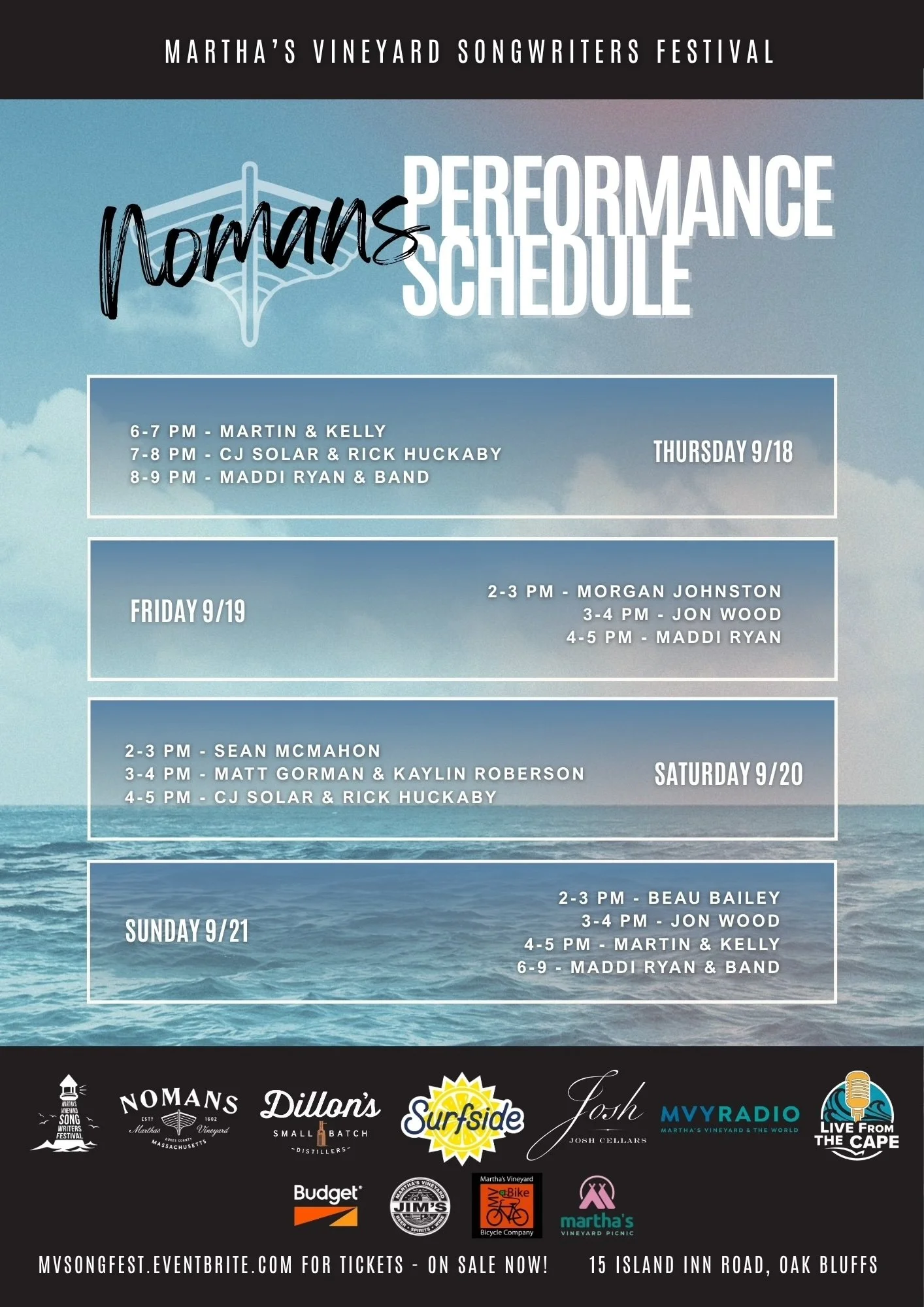 Back to All Events Live Music: MV Songwriters Fest Sunday, September 21, 2025 6:00 PM 9:00 PM Google Calendar ICS